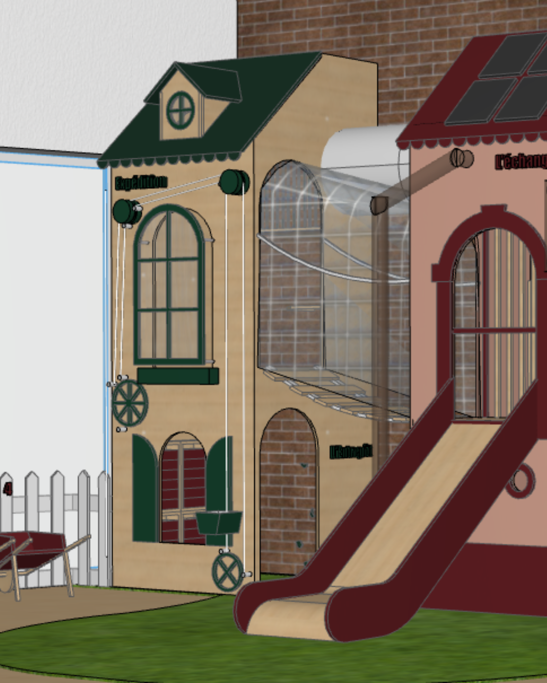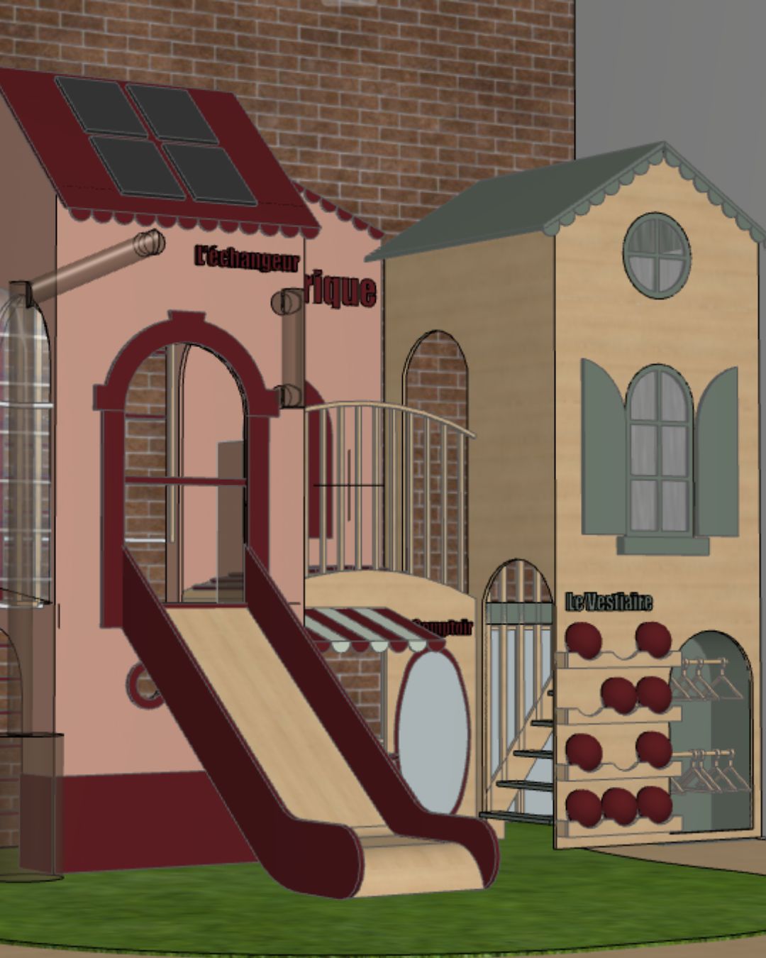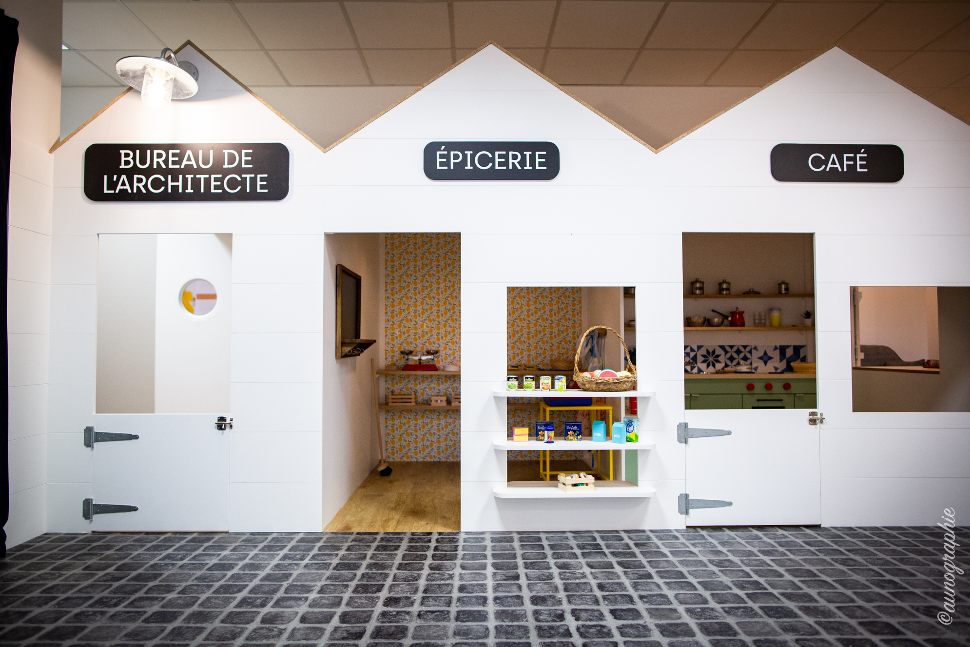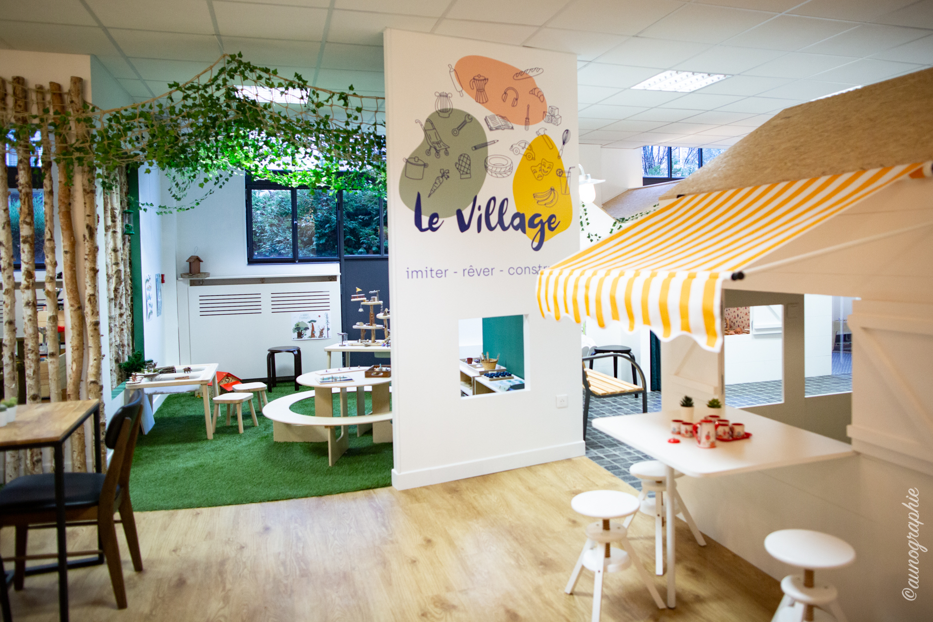 Le Village est constitué de 6 cabanes en bois sur-mesure : le café, l’épicerie, le bureau de l’architecte, la biblio, le garage et la maison. Chaque cabane est entièrement adaptée à la taille des enfants dès 18 mois et permet de développer leur imagination et leur autonomie.