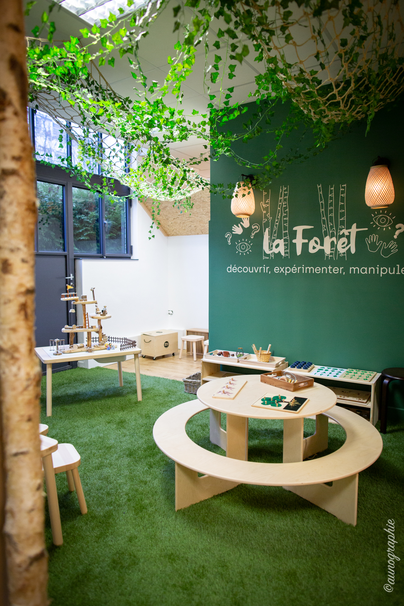 La Forêt invite les enfants dans un univers de naturalité : jeu de sable, transvasement, encastrement, manipulation, construction…