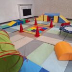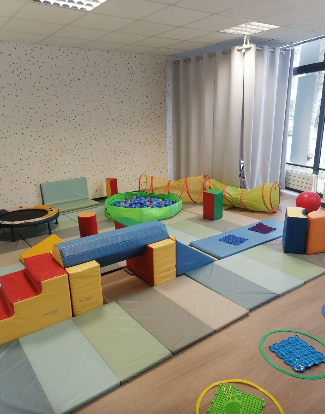 Dans cette salle les enfants pourront profiter de bloc moteurs, piscine à balles, dalles sensorielles, trampoline, balles … pour développer la motricité globale.